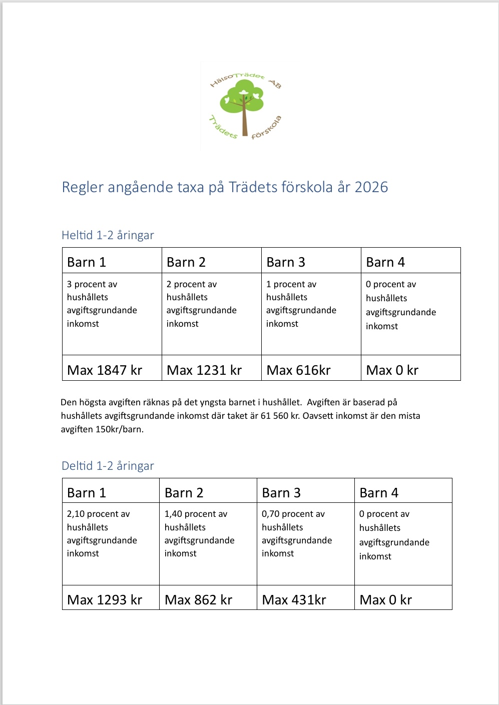 REGLER, ANGÅENDE TAXA PÅ TRÄDETS FÖRSKOLA
