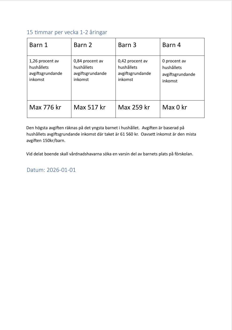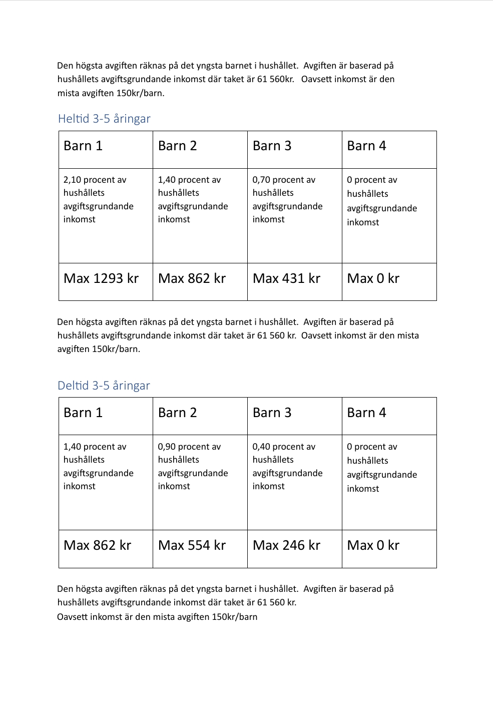 Oavsett lägsta inkomst är den minsta avgiften 150 kr/barn.